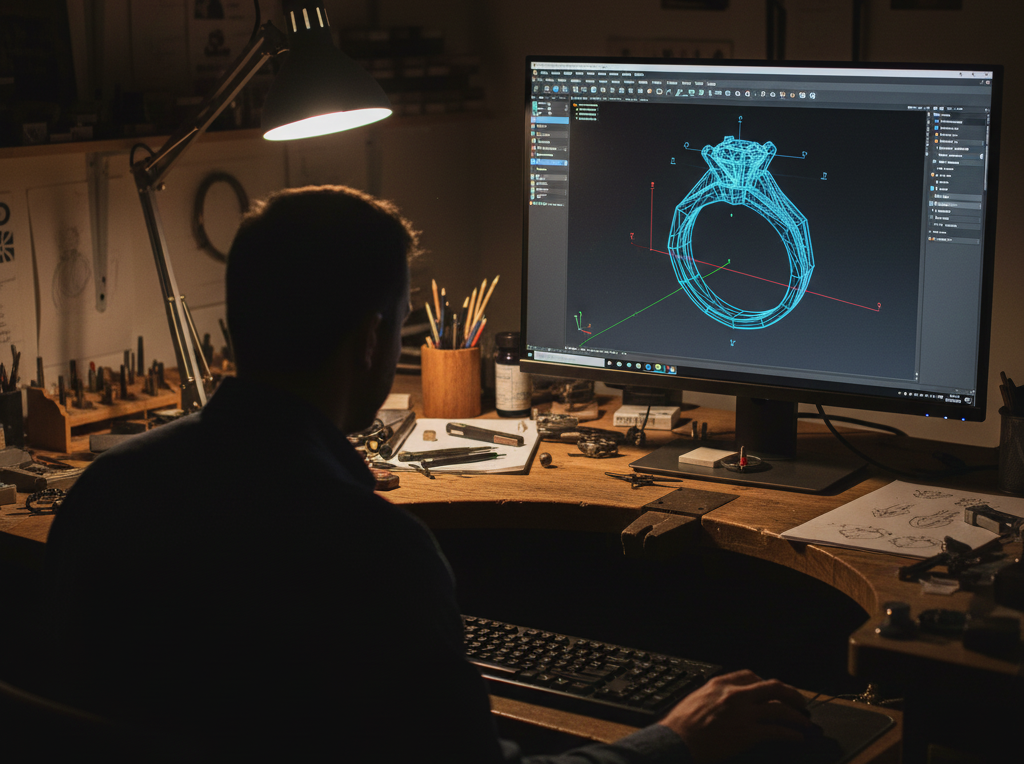 • 02 / THE BLUEPRINT - Using high-precision CAD software, we render your vision into a 3D architecture. You see every angle, every facet, and every shadow before the first stone is set.